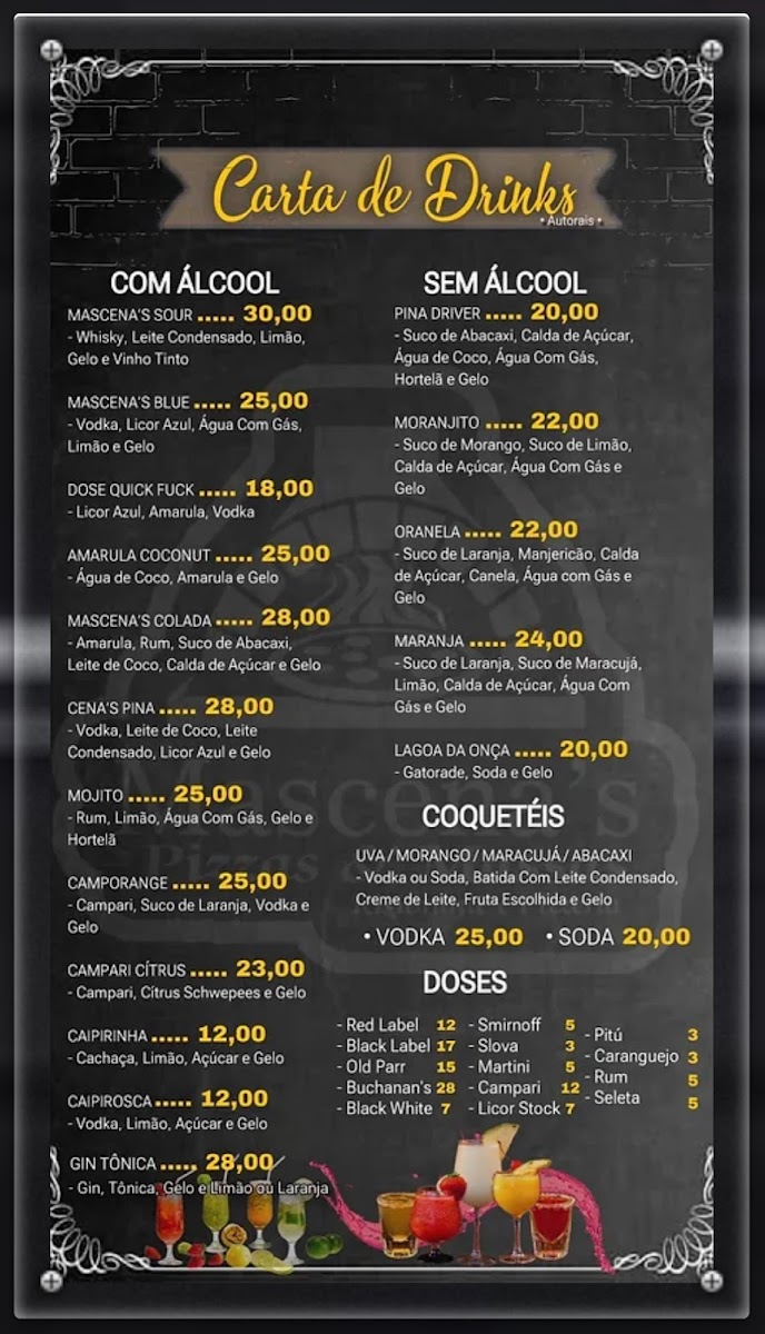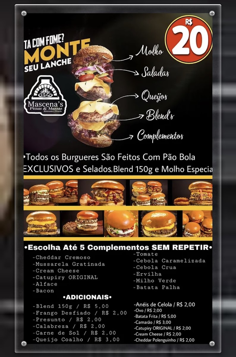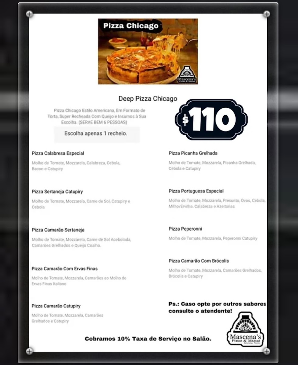 Welcome to Mascena's Pizzas & Massas, where culinary passion meets a diverse menu located in the heart of Santo Antonio, RN, Brazil. Known for their exceptional pizza offerings, the menu includes a range of delicious options from classic Italian to their signature Chicago-style pizza, loaded with fillings. But it doesn't stop there—dive into an array of rich massas, featuring various pasta dishes, and exquisite picanha plates, either individual or double-sized for those extra hungry moments.